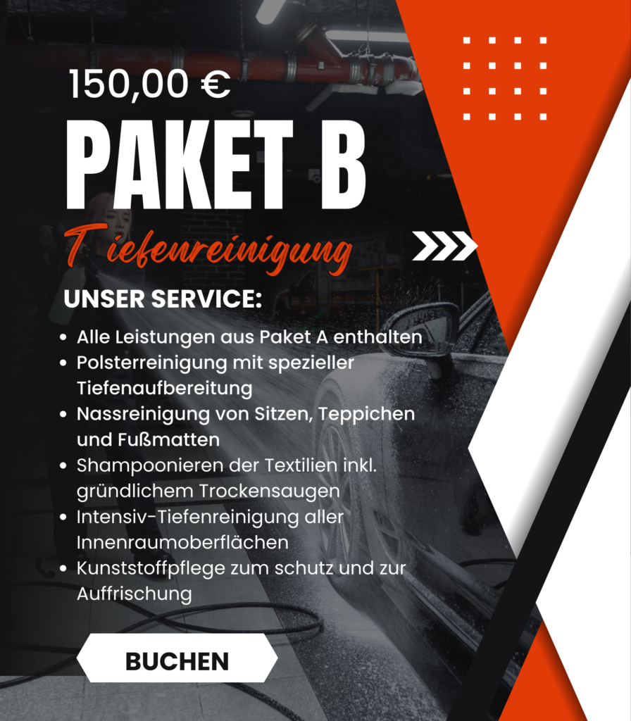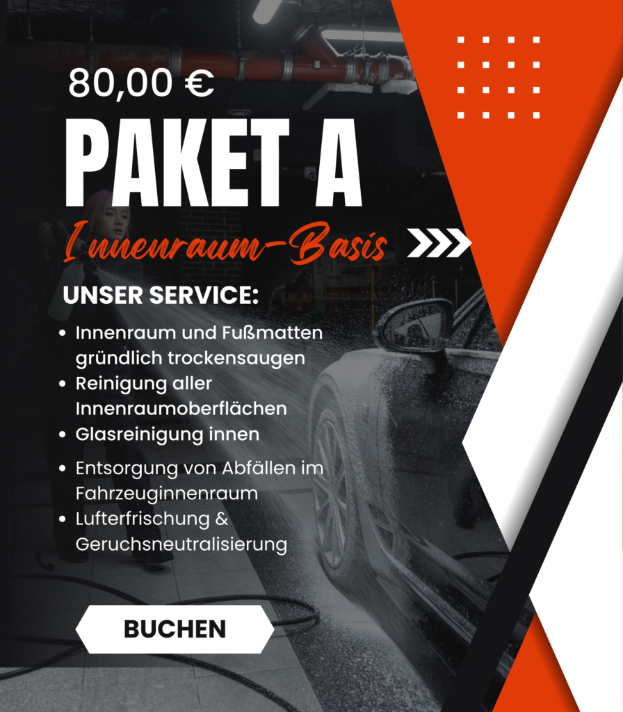 Mit unserer gründlichen Innenreinigung sorgen wir für ein sauberes, gepflegtes und hygienisches Fahrzeuginterieur. Polster, Teppiche, Kunststoff- und Lederflächen werden schonend gereinigt, sodass Sie sich in Ihrem Fahrzeug wieder rundum wohlfühlen. Gleichzeitig tragen wir zum Werterhalt Ihres Fahrzeugs bei.