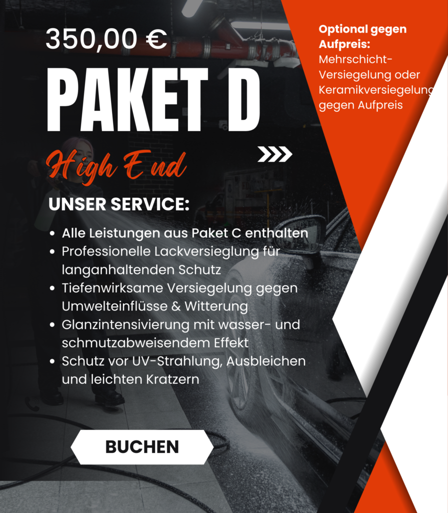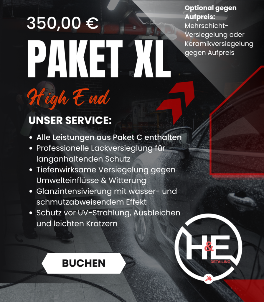 Wir verleihen Ihrem Fahrzeug einen tiefen, langanhaltenden Glanz und schützen die Oberflächen nachhaltig. Durch hochwertige Versiegelungen und Beschichtungen wird der Lack vor Umwelteinflüssen, Schmutz und Witterung geschützt. Das Ergebnis: eine deutlich leichtere Pflege und ein dauerhaft gepflegtes Erscheinungsbild.